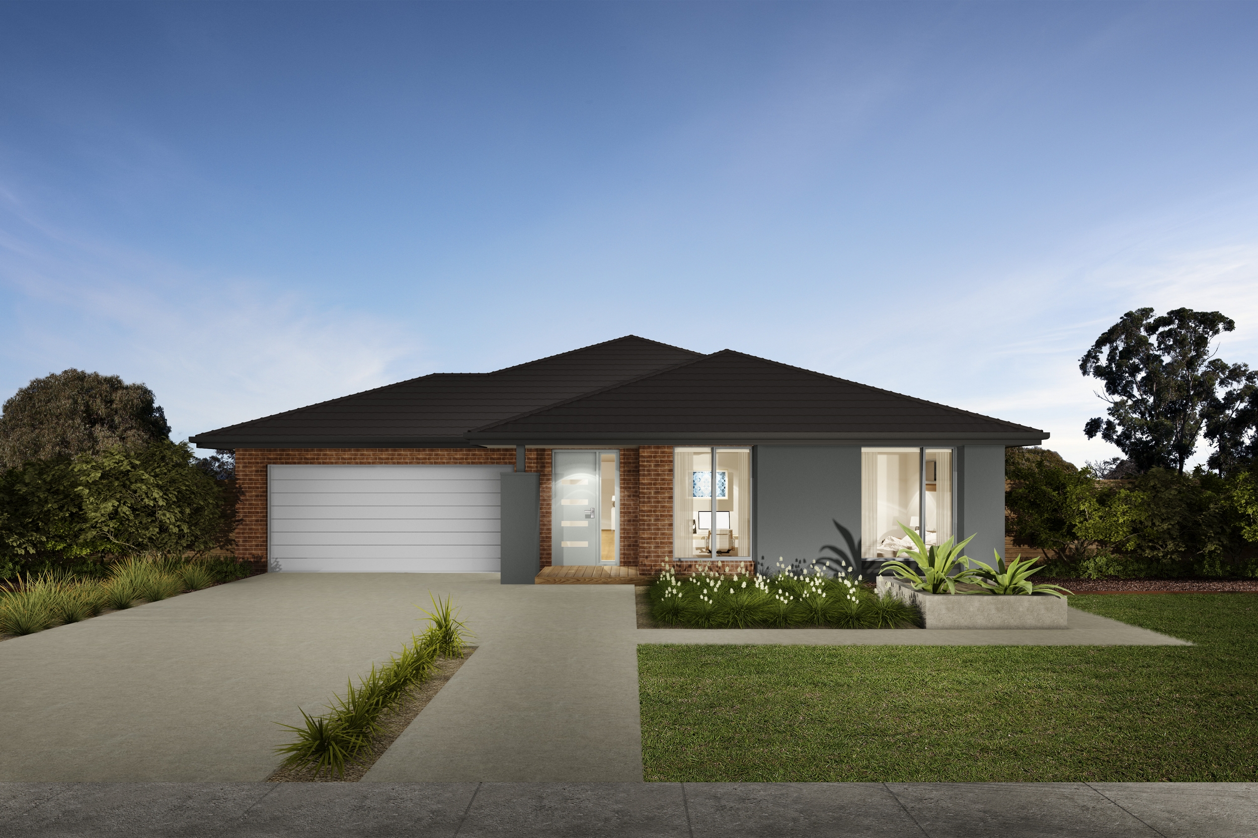 Depicted facades may show optional extras such as feature tiling, upgraded garage doors and driveways that will incur additional costs. Landscaping, decking, fencing, furniture, feature lighting and window furnishings are not provided by Bridgewood Homes.