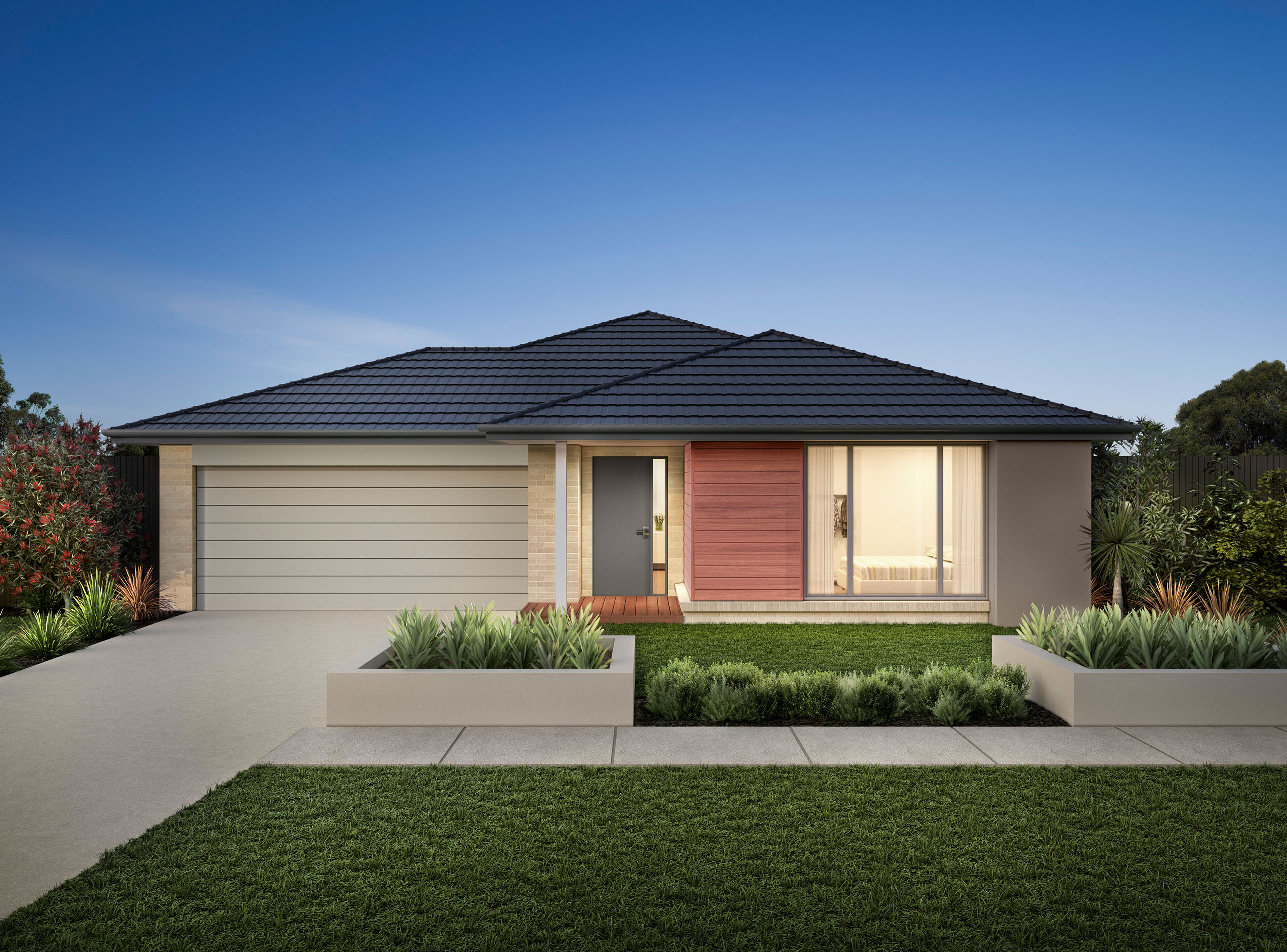 Depicted facades may show optional extras such as feature tiling, upgraded garage doors and driveways that will incur additional costs. Landscaping, decking, fencing, furniture, feature lighting and window furnishings are not provided by Bridgewood Homes.
